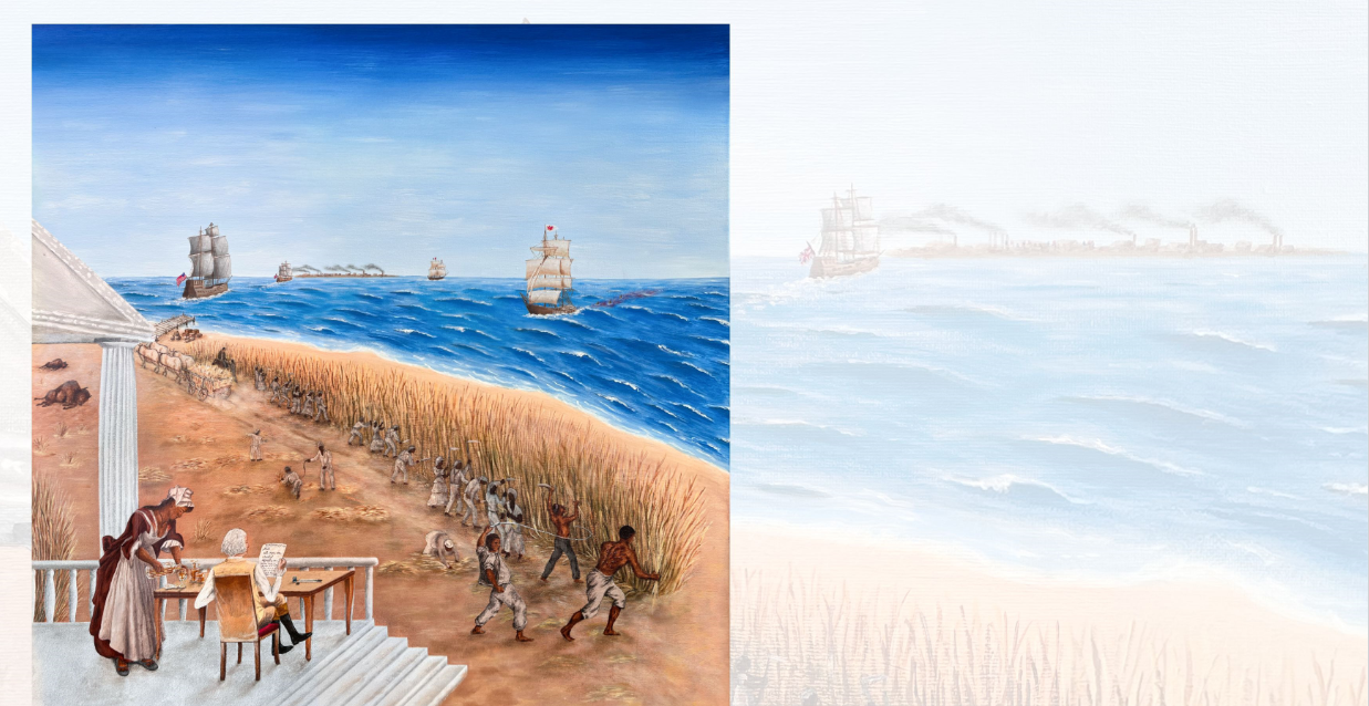 Vier Gemälde des Künstlers Naseer Alshabani eröffnen neue Perspektiven auf Themen wie die kolonialen Wurzeln globaler Ungleichheit, Flucht und Migration sowie Klimaungerechtigkeit. Auch der Umgang mit Raubgütern aus kolonialen Kontexten wird kritisch beleuchtet.